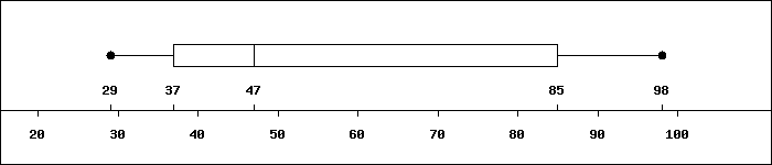 This graphical display identifies the 5-number-summary 1.3.14 associated with the minimum, quartiles 1.3.9, and the maximum. That is, \(y_1, Q_1, Q_2, Q_3, y_n\text{.}\) These values separate the data roughly into quarters. To distinguish these quarters connect \(y_1\) and \(Q_1\) with a straight line (a whisker) and do the same with \(Q_3\) and \(y_n\text{.}\) Use a box to connect \(Q_1\) with \(Q_2\) and the same to connect \(Q_2\) with \(Q_3\text{.}\) Then the boxed areas also identify the IQR.